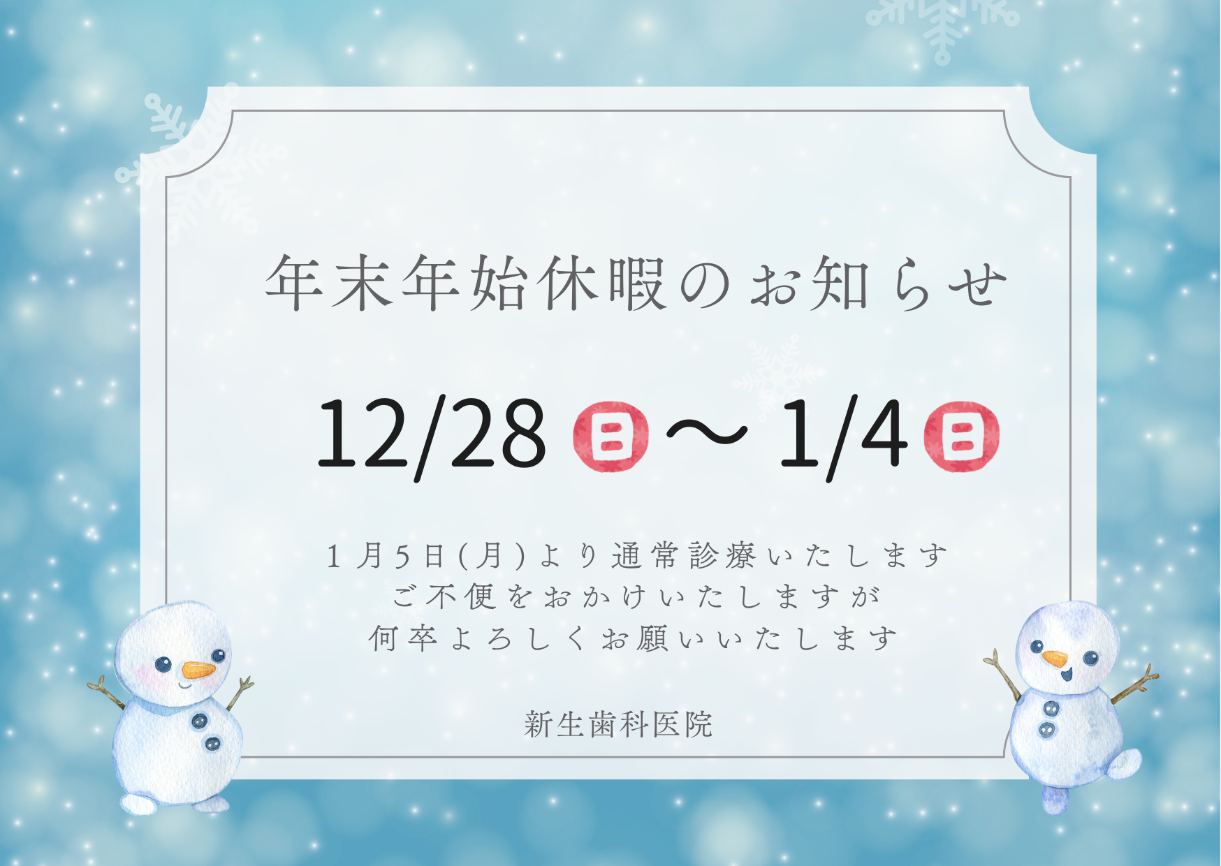 年末年始休暇のお知らせ 2025年12月11日 年末年始のため、休診とさせていただきます。 休業期間中のご不便をお掛けいたしますが、ご理解とご協力を賜りますようお願い申し上げます。 ※2026年1月5日(月)より通常どおり診察を行います。